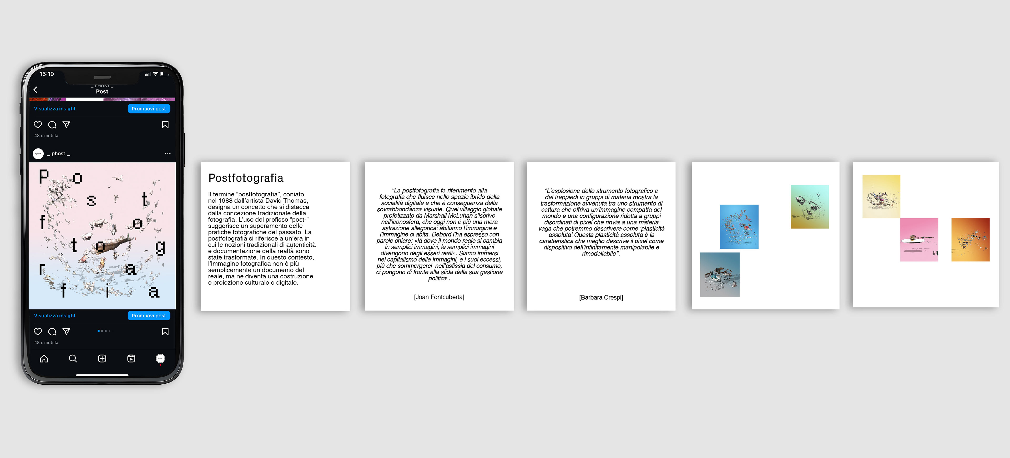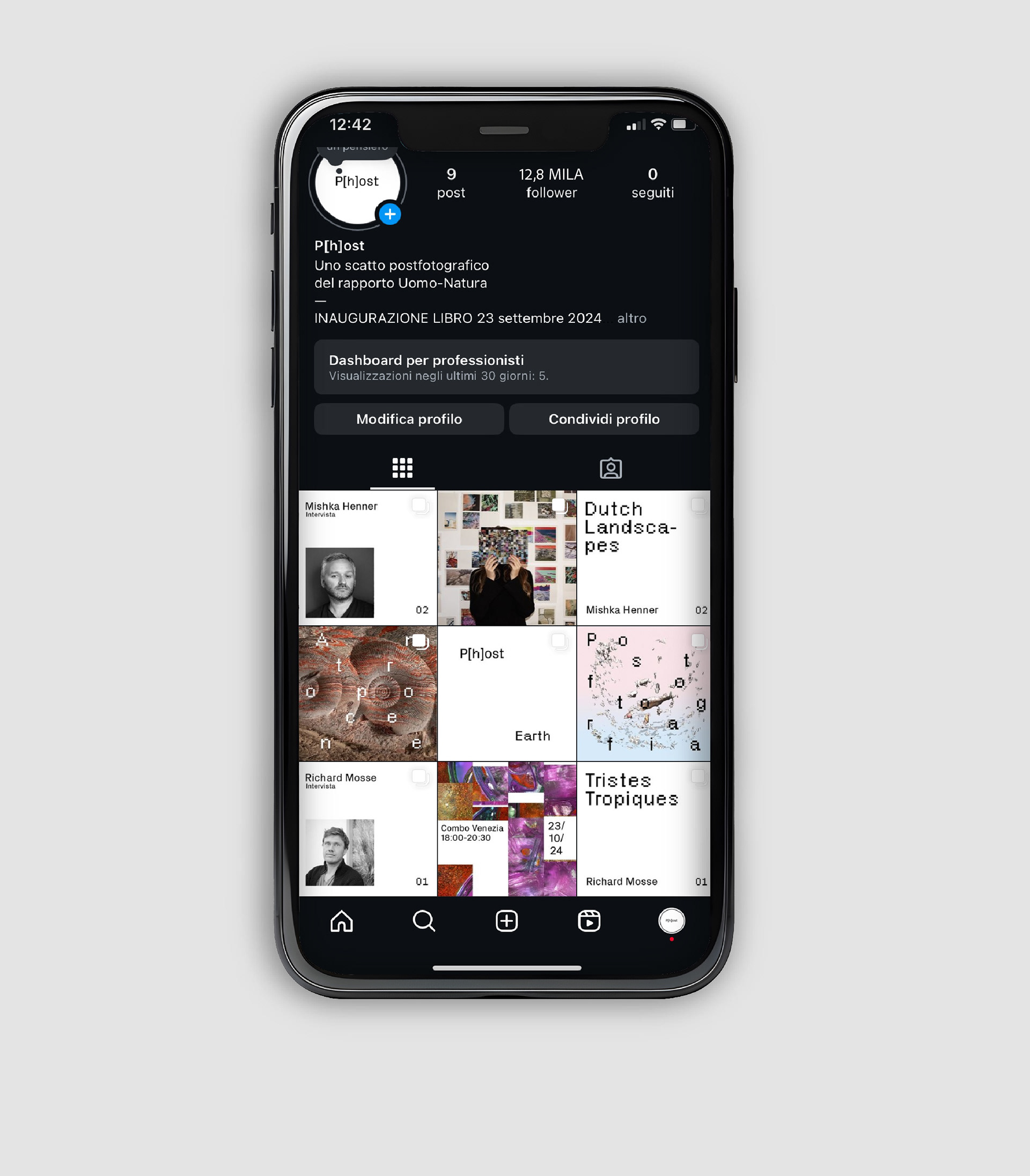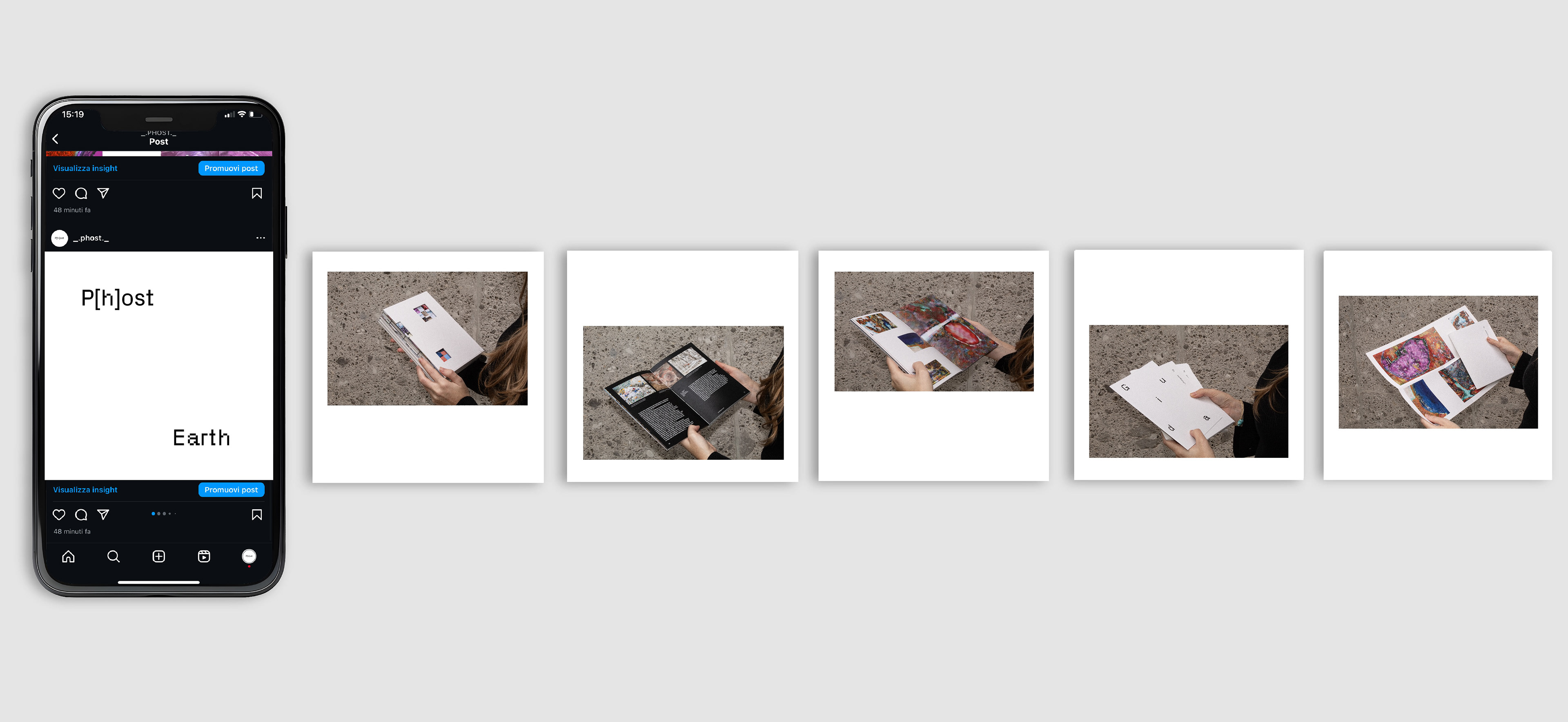 The three-year thesis project P[h]ost is a book-exhibition that investigates a strand of postphotography, in which the manipulated, satellite or unnatural image becomes an art form and a tool through which to express the relationship of the human being with photography in the second digital revolution. This volume, entitled Earth, is proposed as a portable exhibition, in which images become space, capable of representing reality in new and unusual forms, exploring the link between postphotography and visual saturation with the Anthropocene, the environment and new technologies. It is a collection of 10 entries and photographic series by artists and photographers who use new photographic techniques to exploit their expressive power and evoke reflections on current environmental issues and our relationship with planet Earth.